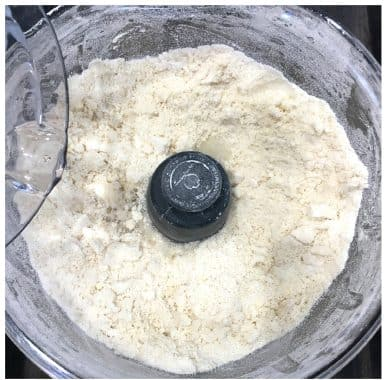 Gradually add the ice cold water and pulse just until the dough comes together (only add as much water as needed). Do not overdo this as maintaining the flecks of butter is critical to achieving a flaky pastry.