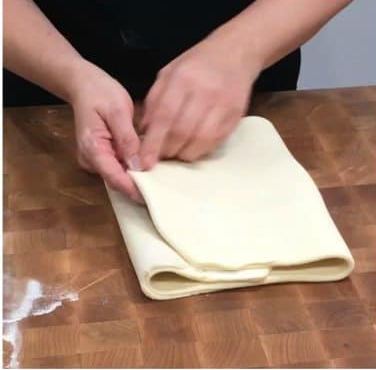 Fold each end of the dough into the middle with one end overlapping the other. Rotate the dough 90 degrees. Repeat all the steps. Wrap the dough in plastic wrap and chill for 20 minutes. Repeat the steps again, wrap the dough and chill for at least one hour before using. The pastry dough can be made a few days in advance or frozen. -