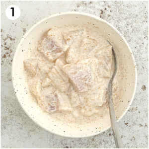 Add the fish cubes to the batter and make sure to coat each piece with batter.