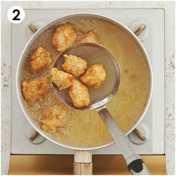 - Maintain the frying oil temperature around 350'F and adjust the heat if needed.