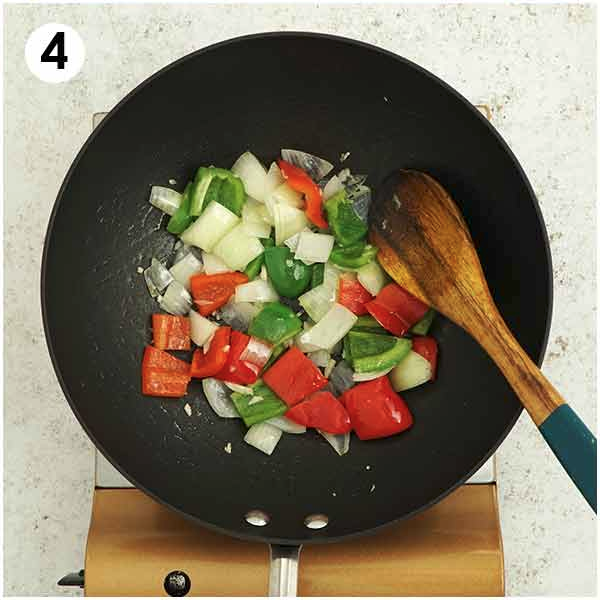 Heat the large wok/pan over medium heat, drizzle oil and stir-fry the garlic onion and bell peppers.